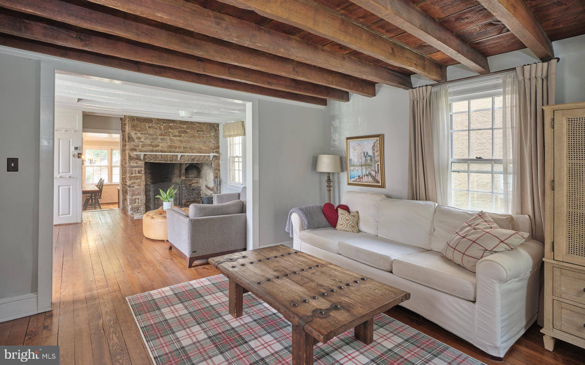 Charming butterfly stairs lead to the second floor which features 3 bedrooms. The primary bedroom has built-in storage and closets that flank windows as well as a sweet window seat providing additional storage. There are two additional bedrooms, the larger of which features a vaulted beadboard ceiling with original beams, track lighting and exposed stone wall. The hall bath on this level features a shower, beadboard wainscot and a pedestal sink. The third level is a suite that provides a birds eye view of the rooftops in Newtown. A bedroom with gabled ceiling opens to a spacious bath with Kohler jetted tub, pedestal sink, and large storage closets.